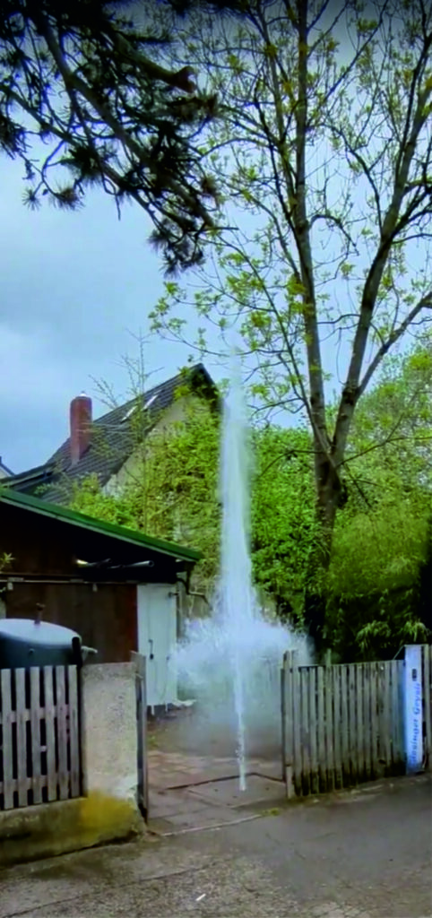 Technisch umgesetzt ist der Geysir mit einer zu einem Druckluftspeicher umgebauten Gasflasche, die auf rund 3 bar befüllt wird. Die Auslösung erfolgt über ein robustes 2-Zoll-Pneumatikventil, das den gespeicherten Druck schlagartig durch ein passendes Rohrsystem auf eine Wassersäule ableitet. Ein eingebautes Rückschlagventil sorgt für zuverlässigen Betrieb und Sicherheit. Das Kunstwerk demonstriert beispielhaft, wie technisches Know-how – von Mechanik und Pneumatik über Elektrik bis hin zur Installation von Sicherheitskomponenten – kreative Ideen zum Leben erwecken kann.